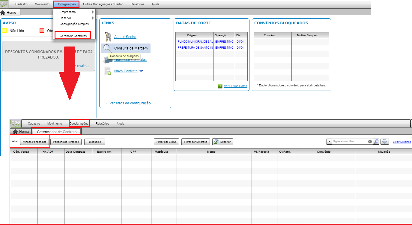 Para regularizar o desbloqueio, basta acessar no menu as abas CONSIGNAÇÕES > GERENCIAR CONTRATOS > MINHAS PENDÊNCIAS.