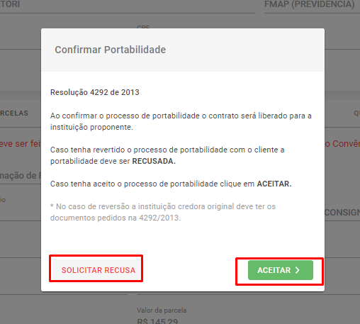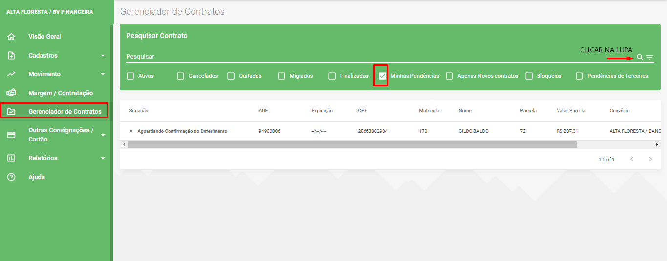 Na listagem, os contratos que estiverem em VERMELHO precisarão ser confirmados, pois são eles que estão bloqueando o convênio.