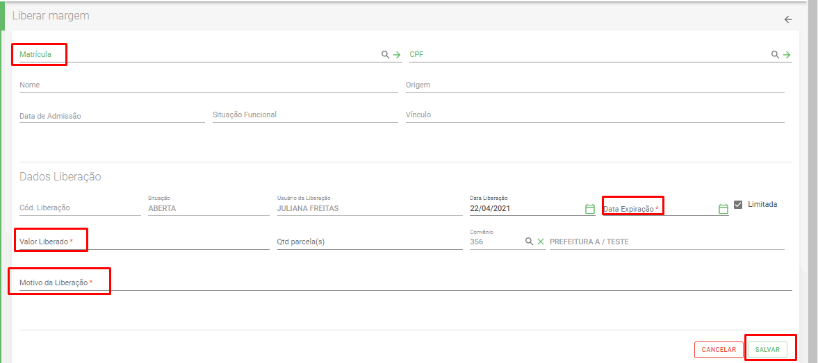 Valor liberado: Deve ser preenchido com valor que deve aparecer como margem disponível para servidor/funcionário. Exemplo : a margem está como 0,00 disponível , se preencher como R$ 150,00, na tela de consulta de margem a margem disponível aparecerá como R$ 150,00.