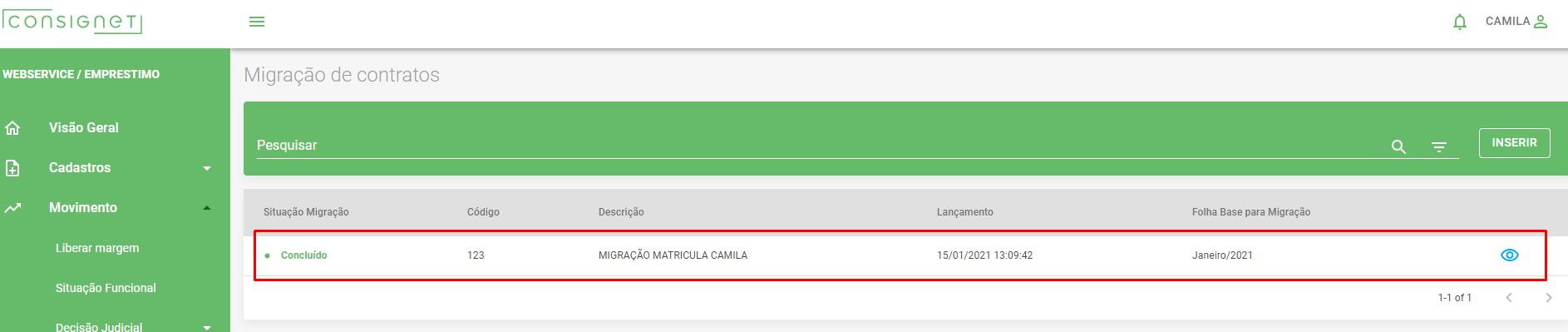 Na gride da tela de migração é possível consultar que o processo foi concluído: