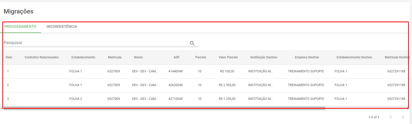 Quando o status estiver em processando, as migrações estão sendo realizadas, permitindo que o usuário realize outros processos no sistema enquanto os contratos são migrados.