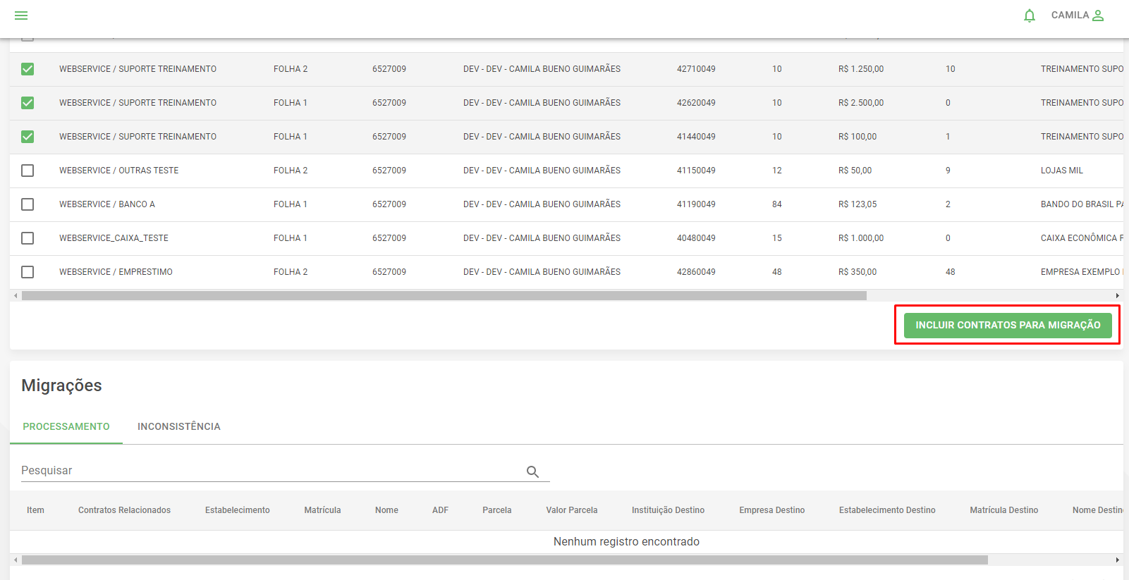 Clique em INCLUIR CONTRATOS PARA MIGRAÇÃO:
