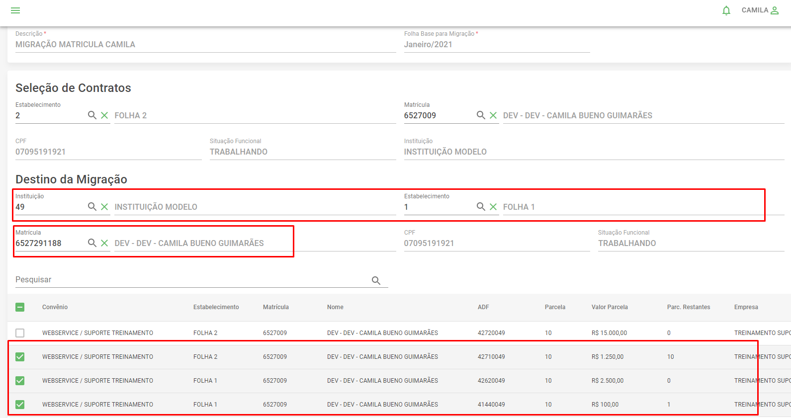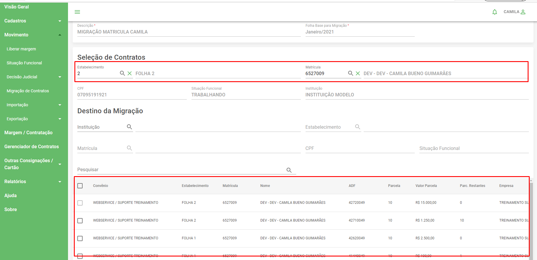 O sistema abrirá a tela onde devemos informar no campo de estabelecimento qual a folha atual da matricula a ser migrada, a matricula que desejamos migrar, assim o sistema irá carregar os contratos disponíveis para migração: