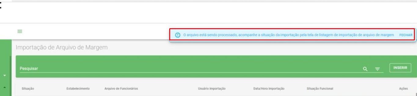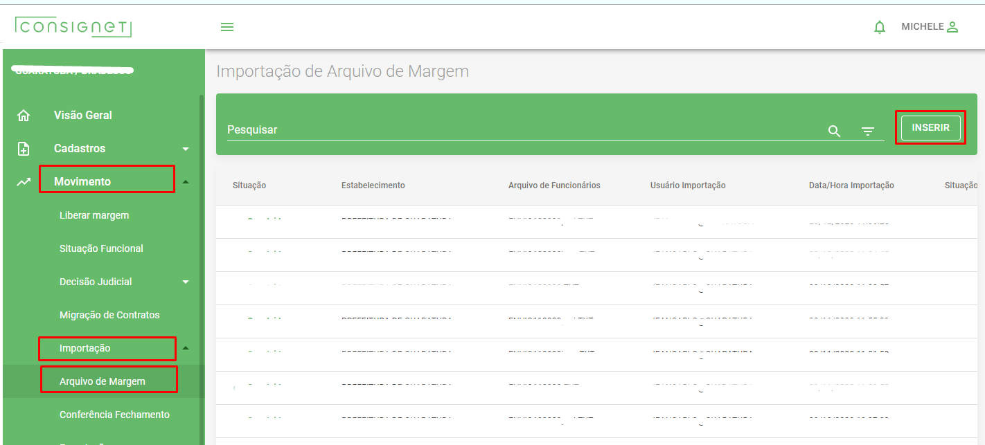 MOVIMENTO > IMPORTAÇÃO > ARQUIVO DE MARGEM > INSERIR