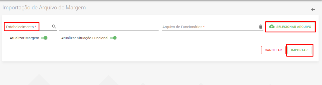 Clicar em SELECIONAR ARQUIVO - Selecione o arquivo de Margem gerado em seu sistema de folha e salvo em sua máquina.