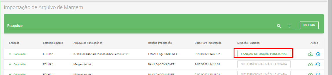 Após concluído o arquivo, na gride será necessário clicar em LANÇAR SITUAÇÃO FUNCIONAL