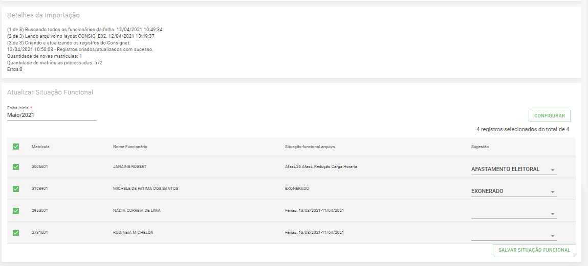 O sistema fará o processamento das situações funcionais, devendo validar a folha inicial da aplicação da situação funcional, que virá preenchido com a folha vigente: