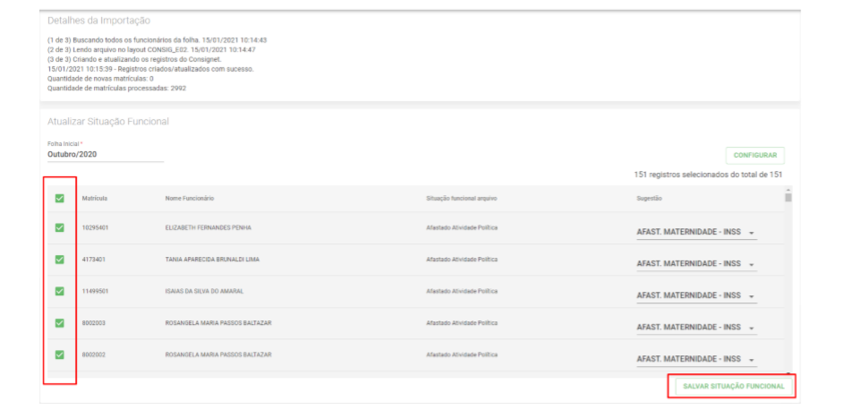 Caso existam situações funcionais para lançar, selecione as matrículas e clique em SALVAR SITUAÇÃO FUNCIONAL
