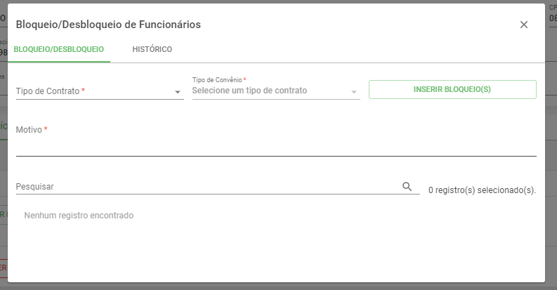 Irá abrir uma nova tela, sendo necessário preencher os campos com * , e clicar em INSERIR BLOQUEIO (S), conforme imagem abaixo :