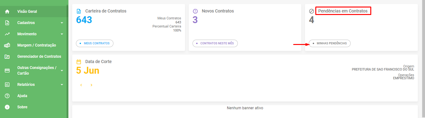 Para verificar as solicitações pendentes é muito simples, basta acessar na tela inicial e ir no menu de "pendencia de contratos", selecione a opção “ minhas pendencias”.