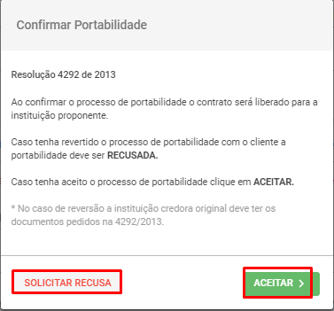 Então caso o contrato tenha sido portado para a instituição proponente clique em “ACEITAR” ou caso tenha sido realizada a retenção do contrato clique em “SOLICITAR RECUSA"