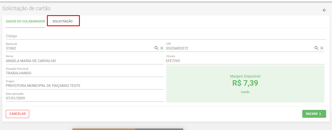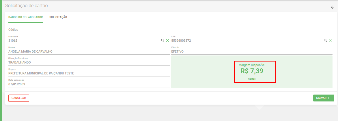 Os dados serão carregados, e apresentará no campo MARGEM DISPONÍVEL o valor que o colaborador(a) terá de margem.