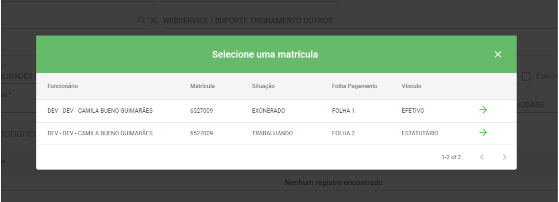 Caso o colaborador (a) tenha mais de uma matricula, ou tenha a mesma matricula de outro colaborador(a) em outra folha de pagamento o sistema vai solicitar que seja selecionado o colaborador (a):