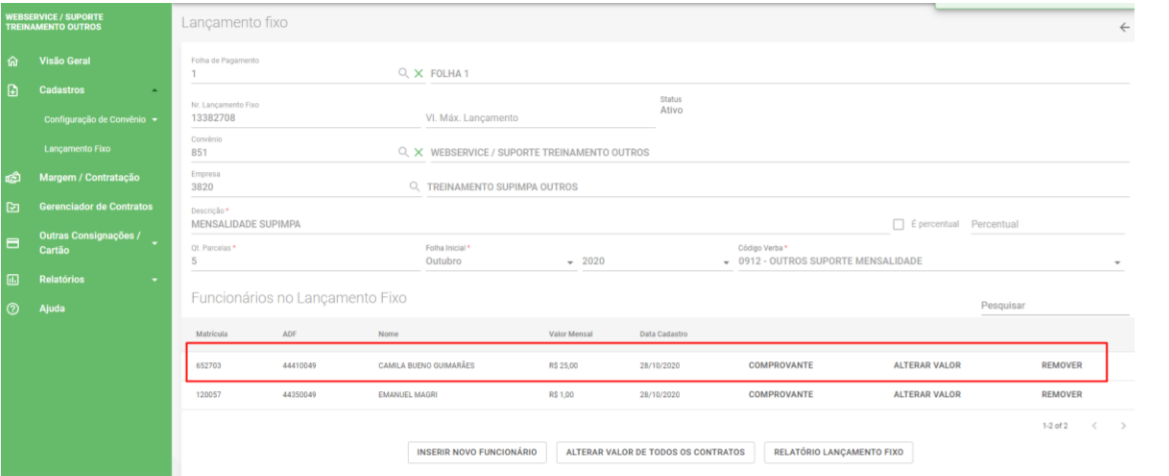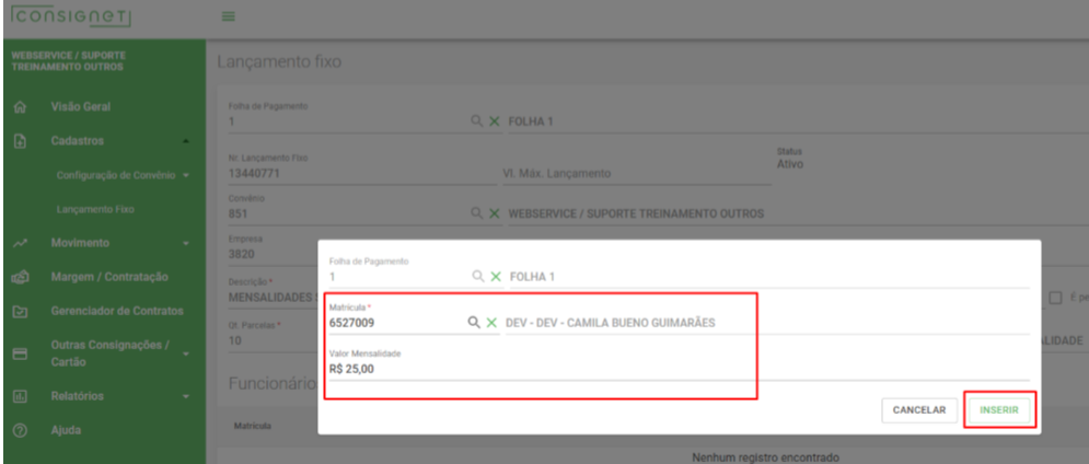 Uma vez selecionado o colaborador (a), informe o valor de desconto e clique em “INSERIR”: