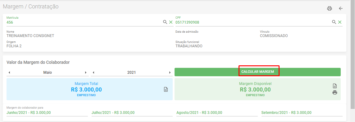 Ao clicar o sistema apresentará a margem do colaborador para os próximos 03 meses e apresentará a tela onde deverá informar os dados da venda.