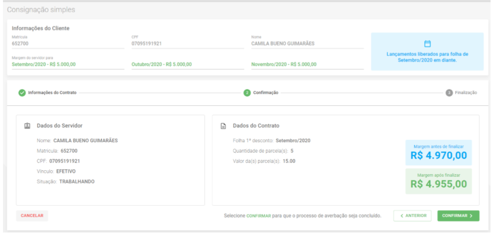 Ao clicar em próximo o sistema trará um resumo dos dados informados para o lançamento do contrato.