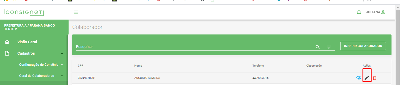 Localizar e o servidor (a) desejado e clicar no ícone de LÁPIS
