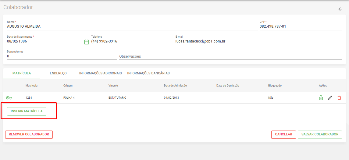 Para inserir uma nova matrícula em um cadastro do colaborador (a) , acesse o menu :