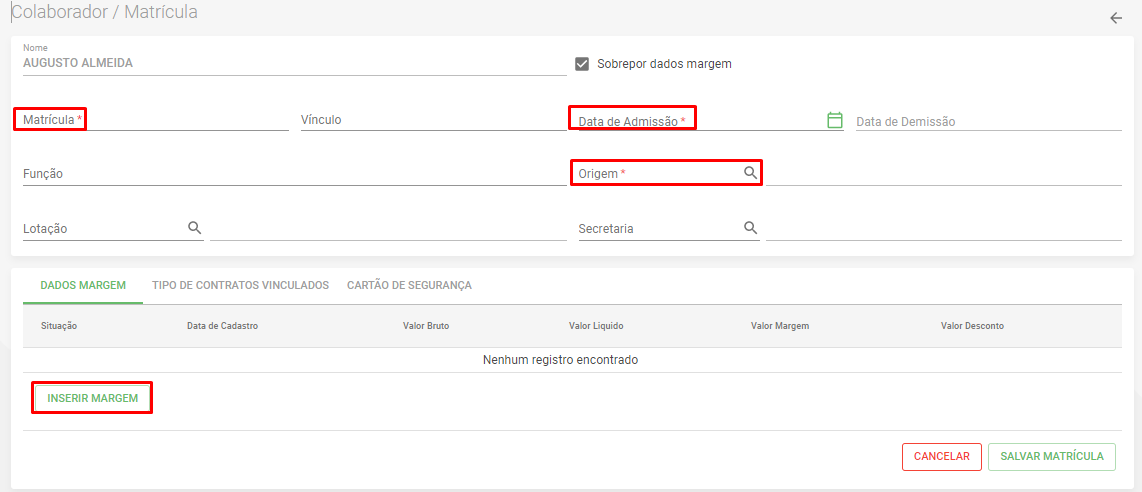 Deverá preencher os campos obrigatórios *, e posterior o preenchimento não esquecer de clicar em INSERIR MARGEM